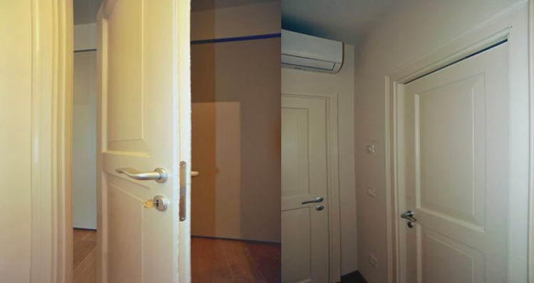 La porta non è incernierata sul fianco ma ruota su di un perno centrale che scorre lateralmente. L’apertura è a spinta ed è possibile da entrambi i lati.